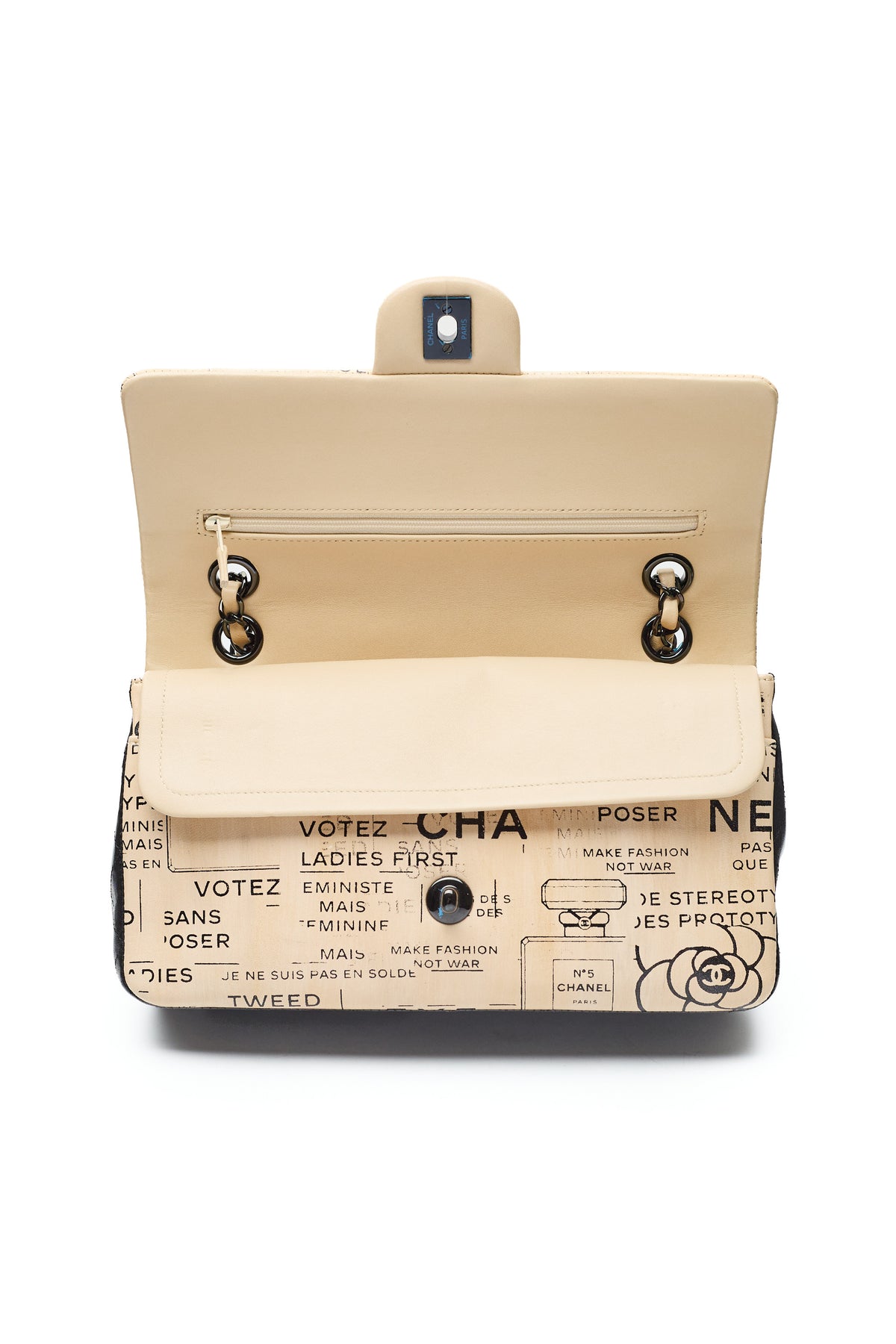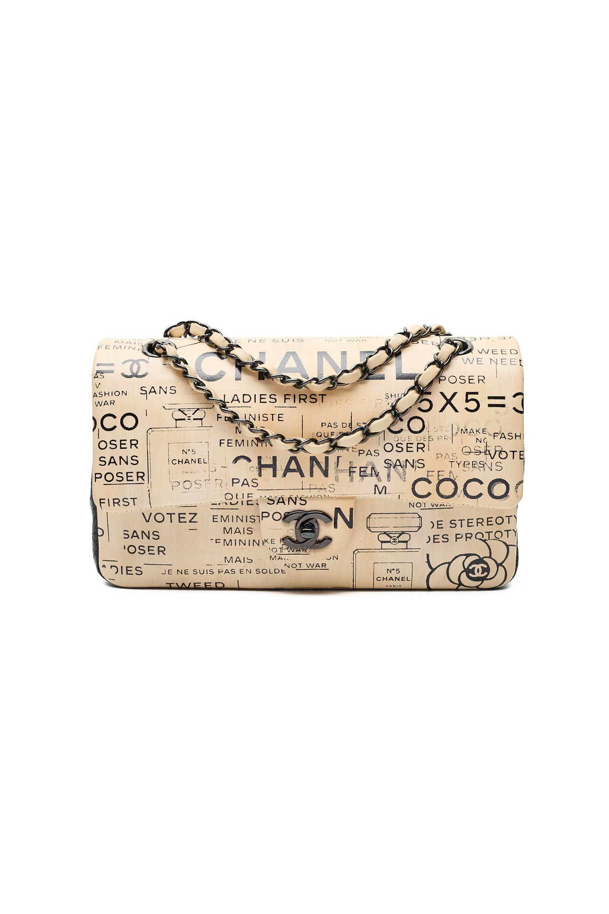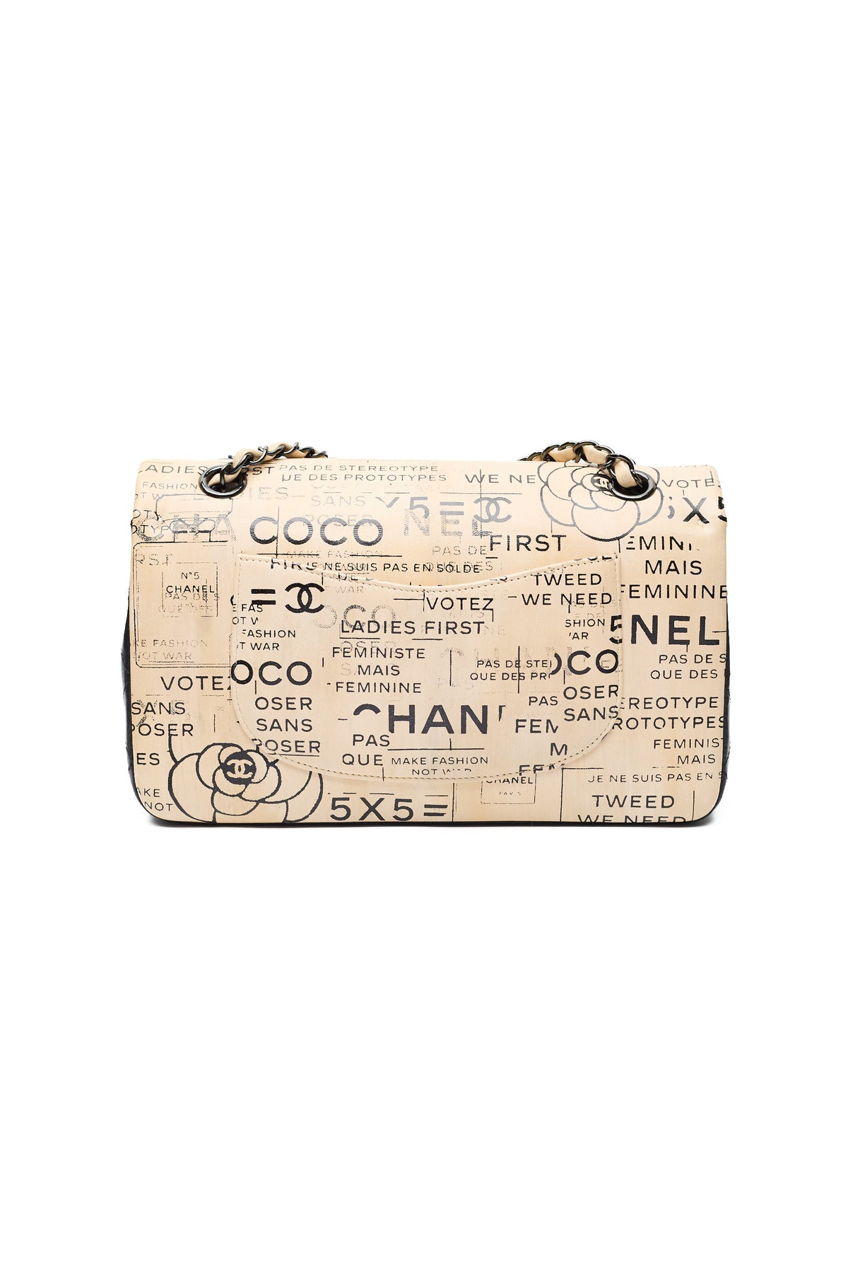 - Various Chanel slogans, logos, and brand designs throughout exterior print